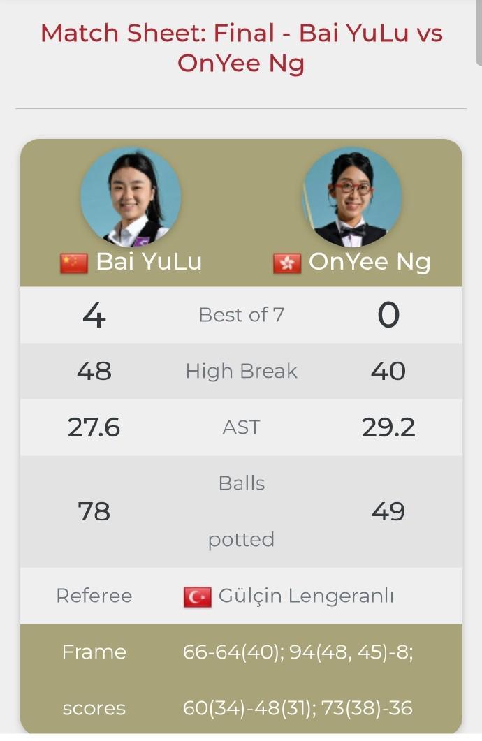 此后,白雨露便基本掌控了比赛。单杆48分和45分足以让她将领先优势扩大一倍,随后在接下来两局中,她又分别打出单杆34分和38分,这最终将她目前在巡回赛上的连胜纪录扩大至39场。